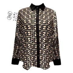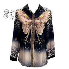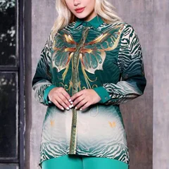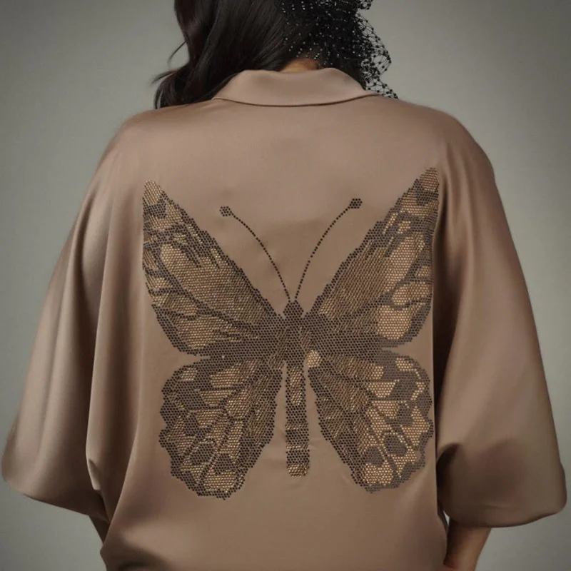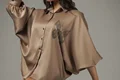 شومیز مجلسی ساتن نگین دار کد 3232 رنگ بژ، در سایزبندی 38 تا 50 . این شومیز از جنس ساتن درجه یک ترک بوده و در دو قسمت پشت و جلوی آن دارای طرح نگین پروانه ای است. قد شومیز 65 سانتی متر از سرشانه بوده و جلو دکمه دار و سرآستین دکمه دار می باشد. اگر تمایل داشته باشید می توانید شومیز را با شلوار و یا دامن استایل نمایید. اگر خواستید شومیز را با دامن استایل کنید پیشنهاد می شود از دامن های کمربند دار استفاده کنید و شومیز را داخل دامن قرار دهید.
