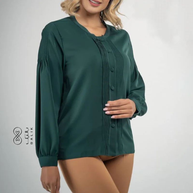 شومیز مجلسی زنانه جلو پلیسه کد vi270 سبز ، در سایزبندی 38 تا 46 . این شومیز در بخش سرشانه و جلوی آن پلیسه می باشد . شومیز جلو دکمه دار بوده و یقه V شکل دارد. قد شومیز از سرشانه 75 سانتی متر است. می توانید این شومیز را با انواع شلوار استایل نمایید. اگر تمایل به استایل کردن شومیز و دامن دارید ، شومیز را داخل دامن قرار دهید.