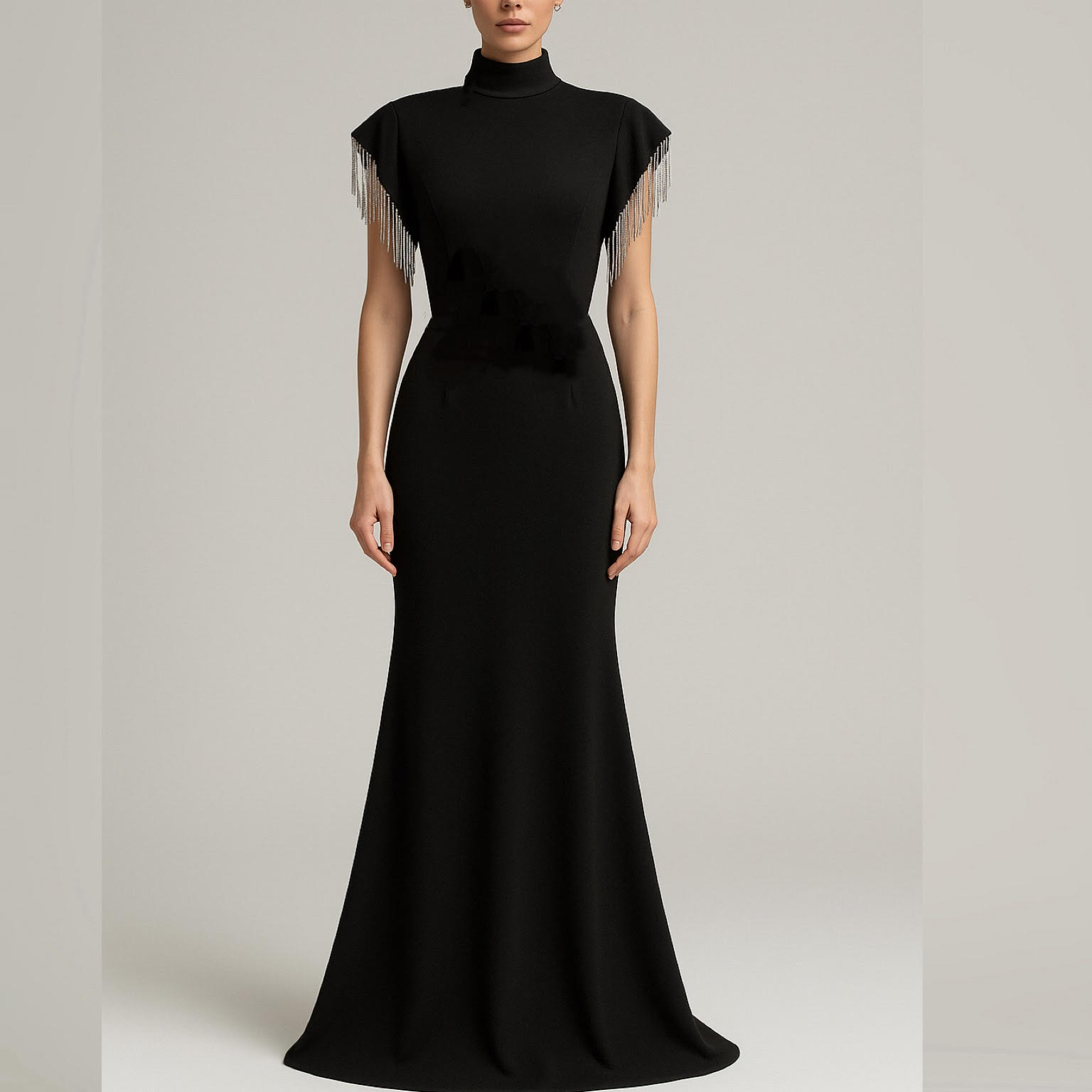 لباس مجلسی ماکسی زنانه کد 1117 مشکی ، در سایزبندی 38 تا 46 . این پیراهن یقه بسته و آستین کوتاه است که در قسمت آستین نوارهای نگین دار دوخته شده است. این پیراهن دارای کمربند پارچه ای می باشد. مدل پیراهن ماهی است . جنس این لباس شب بسیار زیبا کرپ کش می باشد.