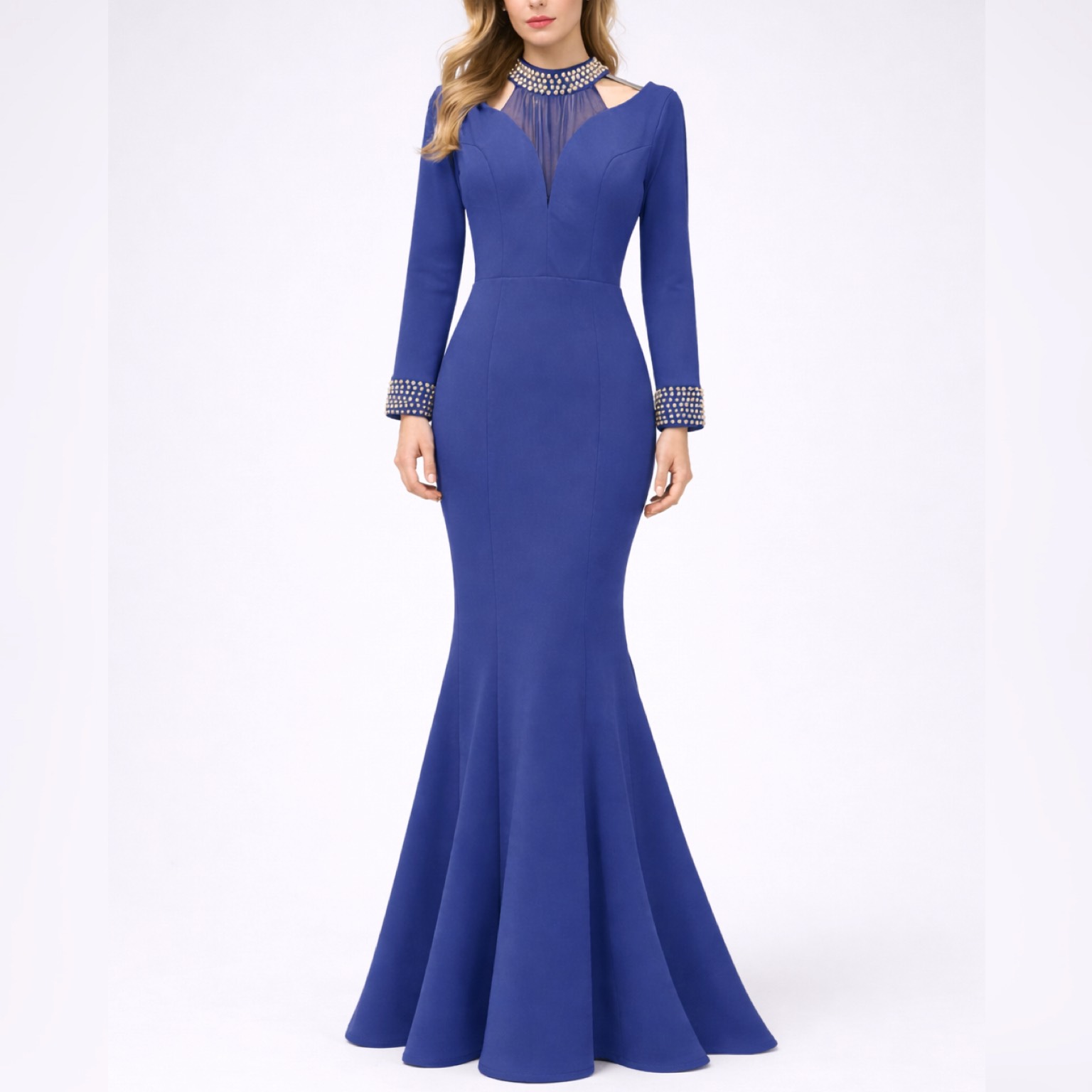 پیراهن ماکسی کار شده مدل ماهی کد pre90 سرمه ای ، در سایزبندی 38 تا 46 . جنس پارچه پیراهن کرپ کش بوده و قسمت یقه و سر آستین ها سنگدوزی است. پیراهن دارای کمربند کار شده مجزا می باشد که در قسمت کمر پیراهن بسته می شود. پیراهن مدل ماهی بوده و در قسمت شکم و پهلو جذب و از زانو به پایین گشاد است و تنخور زیبای آن بسیار چشم نواز است. پیراهن ماکسی در قسمت پایین یقه توری است و کاپدار می باشد.