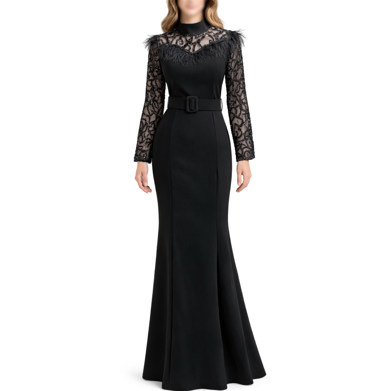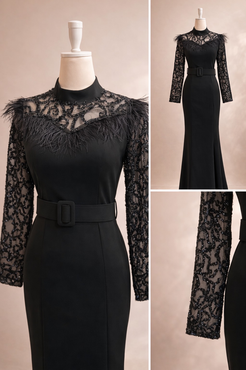 پیراهن ماکسی بالا تنه دانتل و پر و پایین تنه کرپ کش