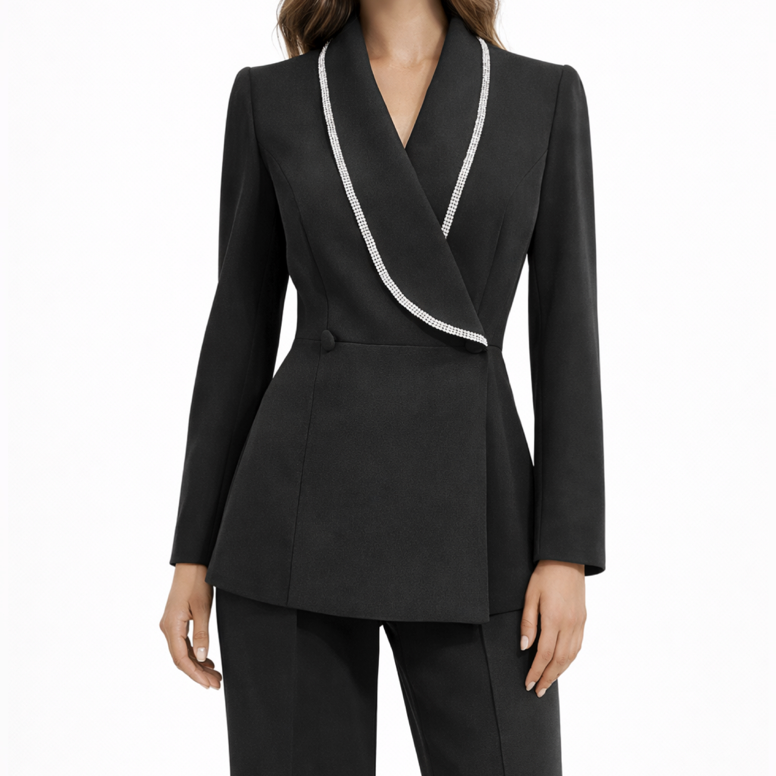با کت و شلوار زنانه مجلسی کار شده کد 714 مشکی، درخشندگی را تجربه کنید! خرید با بهترین قیمت و افزایش جذابیت شما در هر محفل. سایزبندی 38 تا 46 . کت و شلوار کار شده مجلسی از جنس کرپ باربی بوده و دوخته و پارچه بی نظیر آن تنخور زیبایی را ایجاد می نماید. قد کت از قسمت پشت 75 و از قسمت جلو 68 سانتی متر می باشد. برش کمر به پایین کت کمی آزاد بوده شکم و پهلو در کن مشخص نمی باشد. شلوار این ست از نوع شلوار بوت کات است.