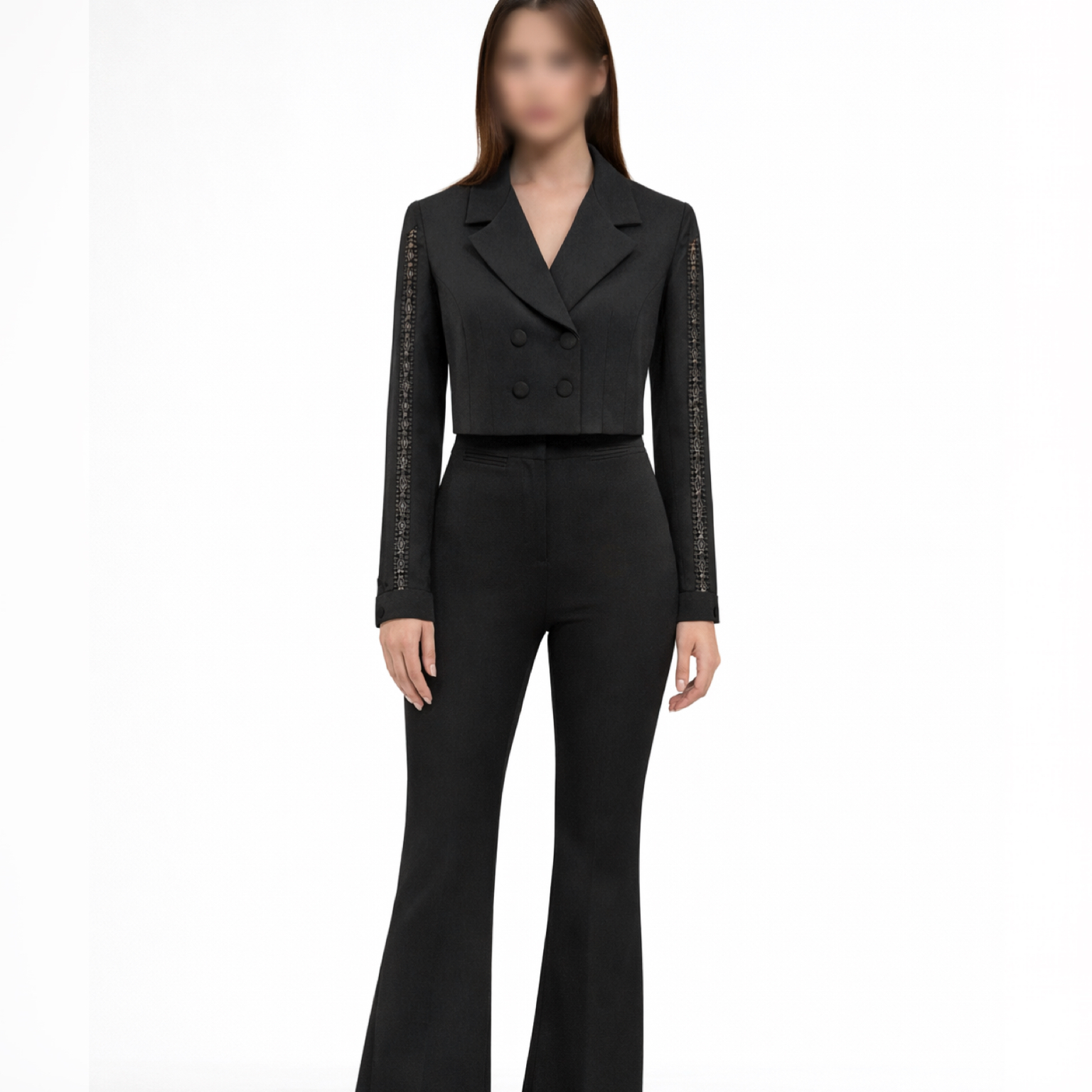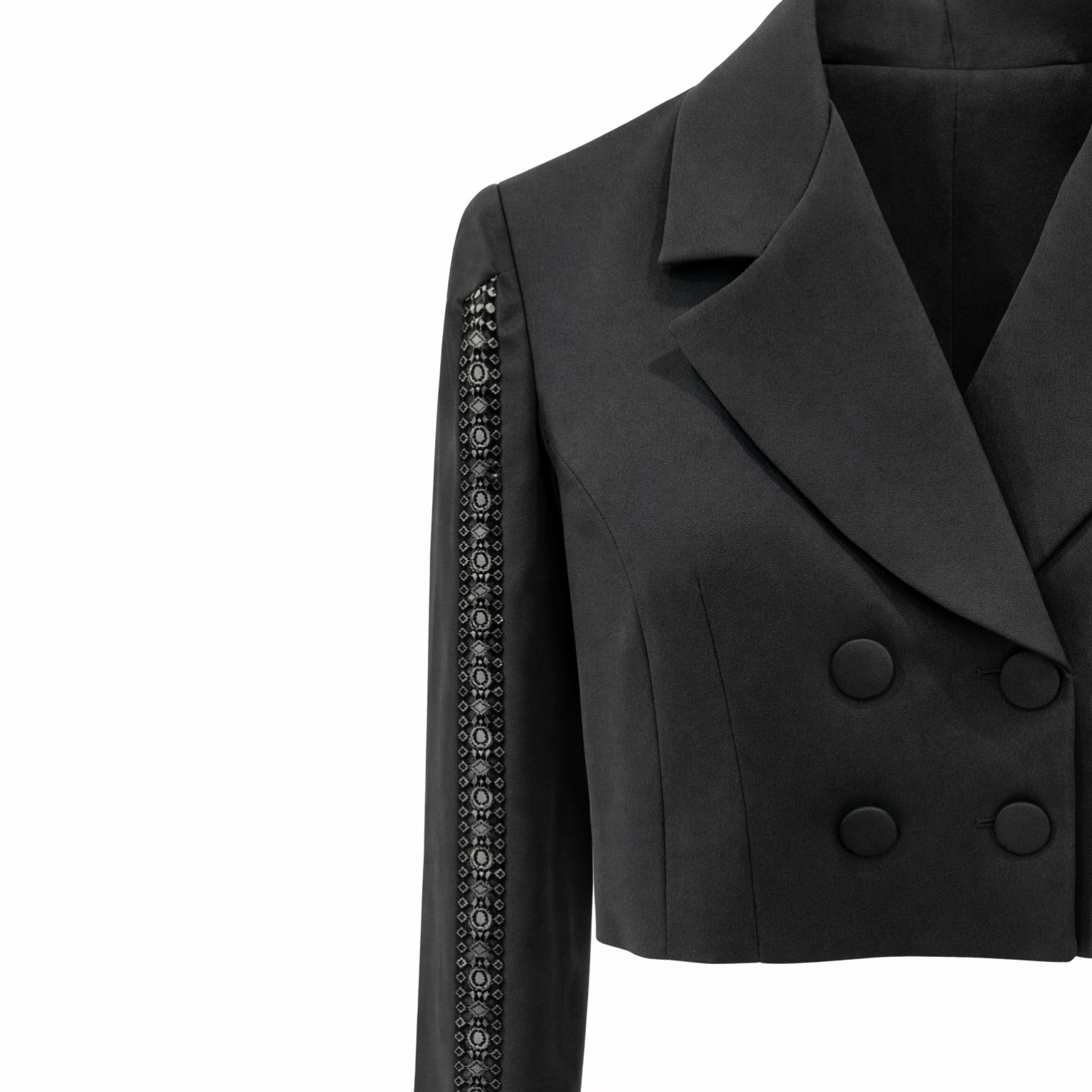 کراپ کت مجلسی کد he50 آستین دانتل مشکی ، در سایزبندی 38 تا 46 . کراپ کت از جنس کرپ مازارتی بوده و آستین ها دانتل است. قد کراپ کت از سرشانه 55 سانتی متر است. این کراپ کت را می توانید با انواع شلوار بگ و بوت کات به زیبایی استایل نمایید همچنین کراپ کت را می توانید با دامن نیز استایل نمایید . این کت شیک زنانه برای کاربرد بر روی انواع لباس مجلسی نیز مناسب است.