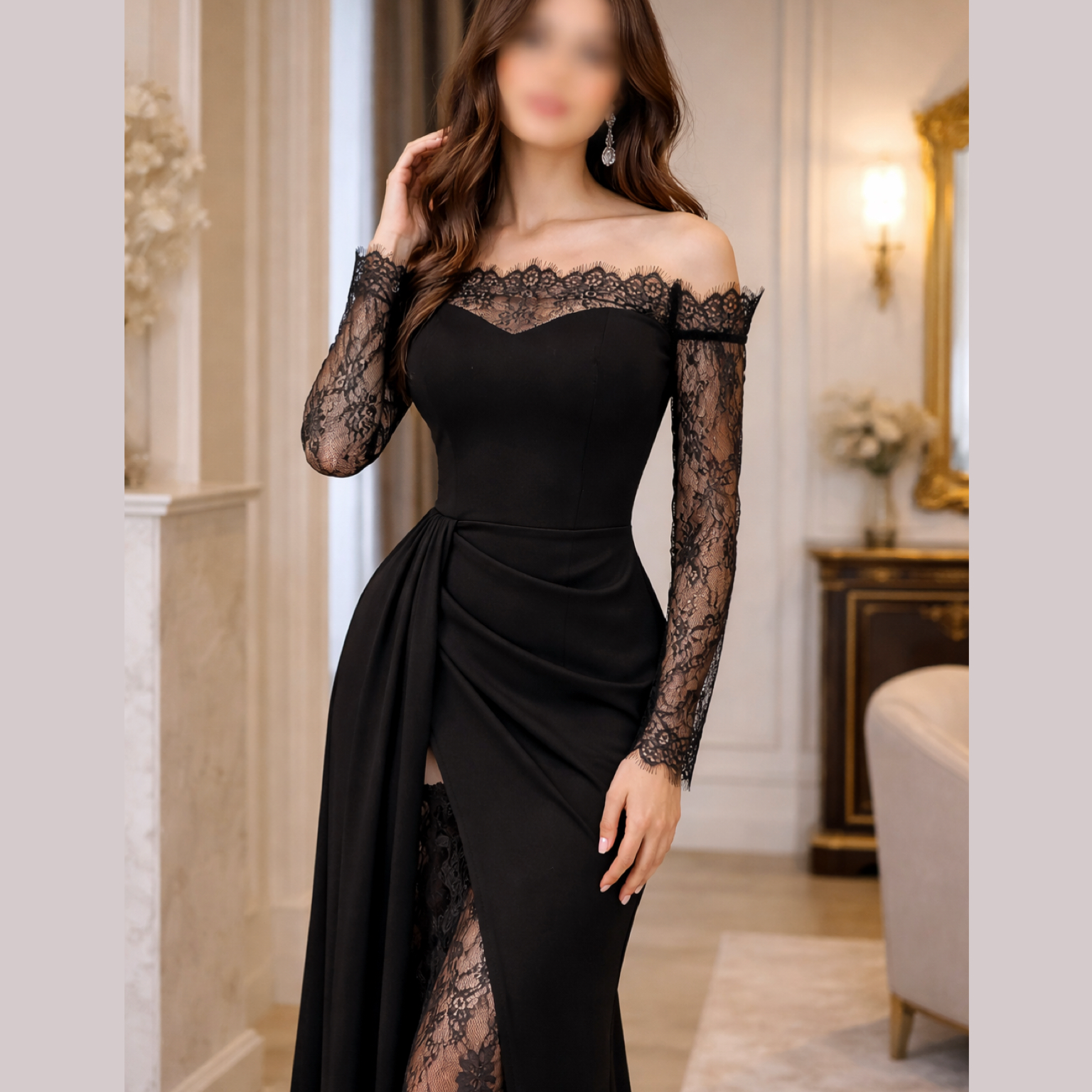 پیراهن ماکسی دانتل فرانسه پوشیده کد 862 مشکی ، در سایزبندی 38 تا 46 . این پیراهن ترکیب پارچه کرپ درجه یک و دانتل فرانسه است. پیراهن آستین دار بوده و قسمت چاک آن نیز با دانتل فرانسه کاور شده است. این پیراهن ماکسی جلو پیله دار است و به سبب پیله های لباس شکم و پهلو در آن مشخص نیست.