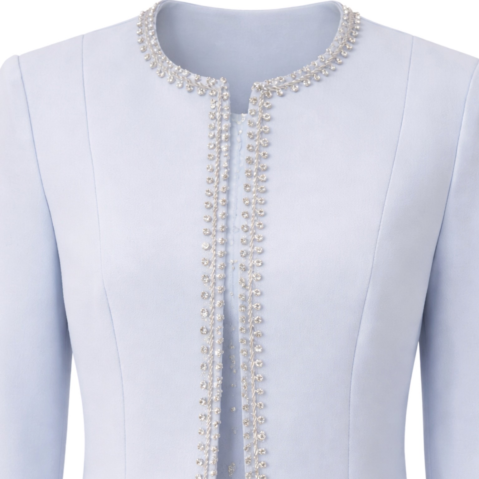 سارافن کت کار شده مجلسی زنانه کد 4052 رنگ آبی روشن ، در سایزبندی 40 تا 48 . کت در اطراف یقه کار شده می باشد و سارافن آن حلقه ای است. سارافن کت از جنس کرپ مازراتی است و یقه گرد می باشد. قد دامن سارافن 90 سانتی متر است. سارافن کت را می توان برای انواع مجالس خانگی و یا عقد محضری به کار برد. سارافن دارای دامن کلوش بوده و کمربند دار است.